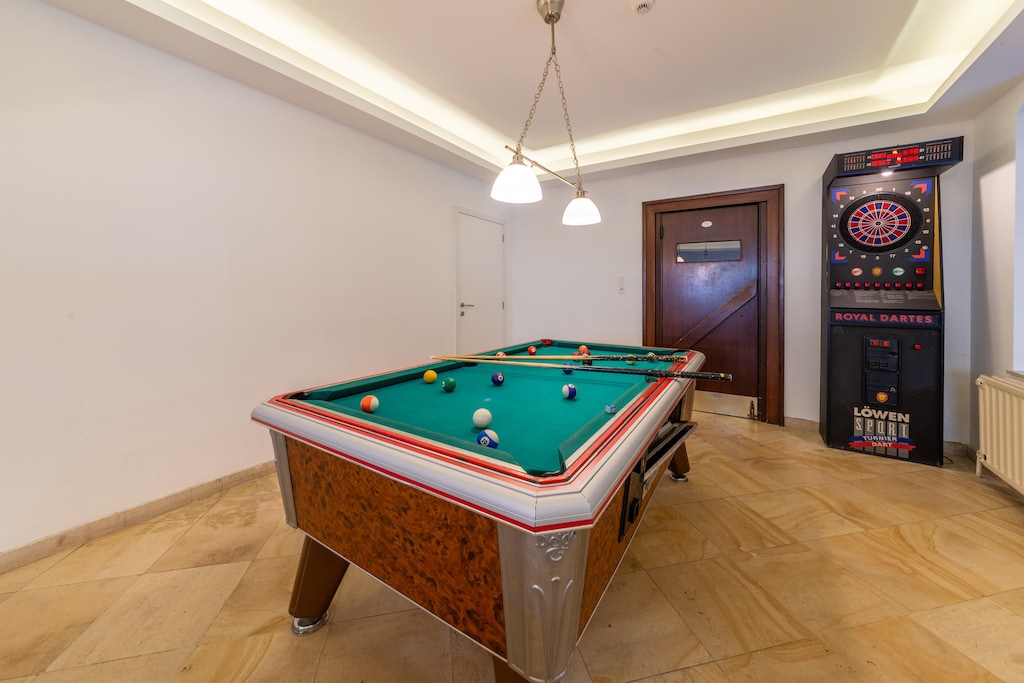 De keuken is van alle gemakken voorzien, waaronder een oven, magnetron en vaatwasser. In de woonkamer vindt u tevens een bar. De recreatieruimte beschikt over een tafeltennistafel, tafelvoetbalspel en biljart. Er zijn ook speeltoestellen voor kinderen aanwezig.