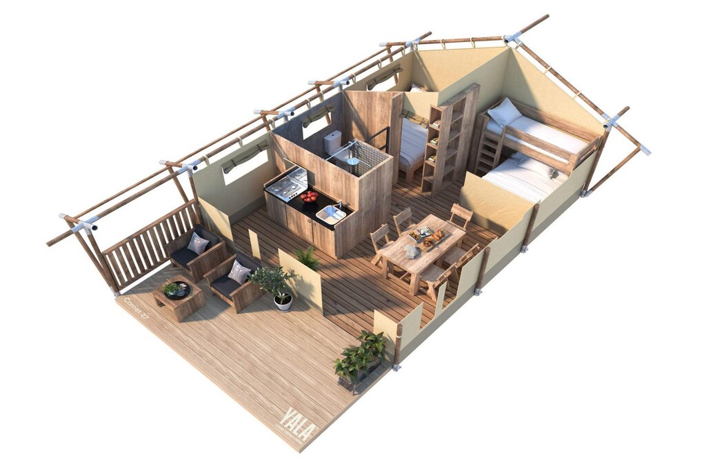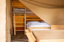 De glampingtenten zijn goed uitgerust om een comfortabel en handig verblijf te garanderen. Elke tent beschikt over een hoofdslaapkamer met een tweepersoonsbed, een tweede slaapkamer met een tweepersoonsbed en stapelbedden en een gezellige woonkamer met een zithoek en eettafel. De kitchenette is voorzien van een koelkast, magnetron, koffiezetapparaat en elektrisch fornuis, samen met alle benodigde kookgerei. Andere voorzieningen zijn een pelletkachel voor warmte, wifi, een eigen toilet en douche, tuinmeubilair met een parasol en een loungeset om buiten te ontspannen. Huisdieren zijn welkom en er is parkeergelegenheid in de buurt voor uw gemak.