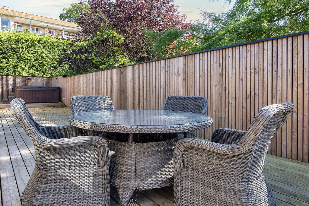 Eine ganz zentrale Lage in Ebeltoft, in der Nähe von Wasser, Wald und der Ortsmitte, bietet dieses Ferienhaus mit Meerblick sowie schöner Terrasse mit Standwasser-Whirlpool im Freien. Im Ferienhaus gibt es zwei Schlafzimmer mit je einem Doppelbett. Im Eingangsbereich zudem Schlafsofa. Im Wohnzimmer steht außerdem eine doppelte Schlafcouch zur Verfügung, sodass Sie sich Ihren Schlafplatz aussuchen können. Der Wohnbereich mit Küche und Essecke ist offen und modern sowie in hellen Farben eingerichtet. Messingfarbene Armaturen im Bad und in der Küche. Alles ist ansprechend und typisch skandinavisch gestaltet. Stellplatz vor dem Haus. Das Haus ist außen mit Holzlamellen verkleidet und alles passt gut zusammen. Keine Vermietung an Jugend- oder Handwerkergruppen erwünscht!A refundable deposit might be charged closer to your check-in date. The security deposit ensures a smooth stay and covers any additional services or consumption charges.This deposit covers utilities consumed during your stay and any additional services that may be taken.The final amount will be adjusted based on actual meter readings, actual usage of extra services, and any remaining balance will be refunded within 21 days after checkout.This deposit simply acts as a prepayment for charges that you would anyways pay for, ensuring a seamless stay and check-out experience.