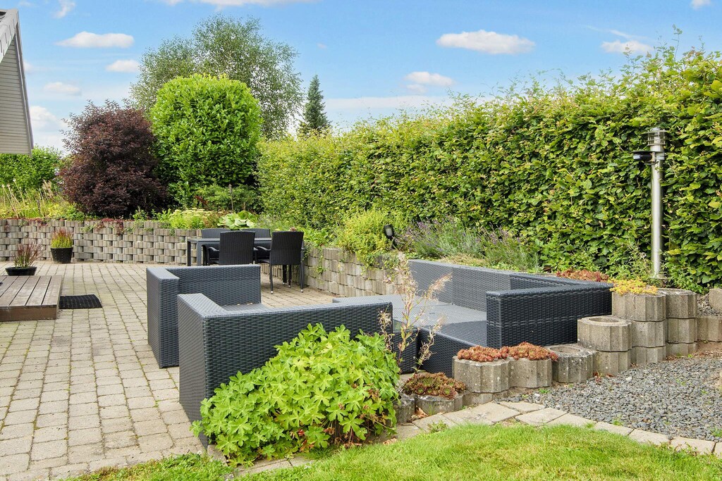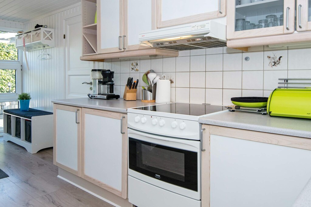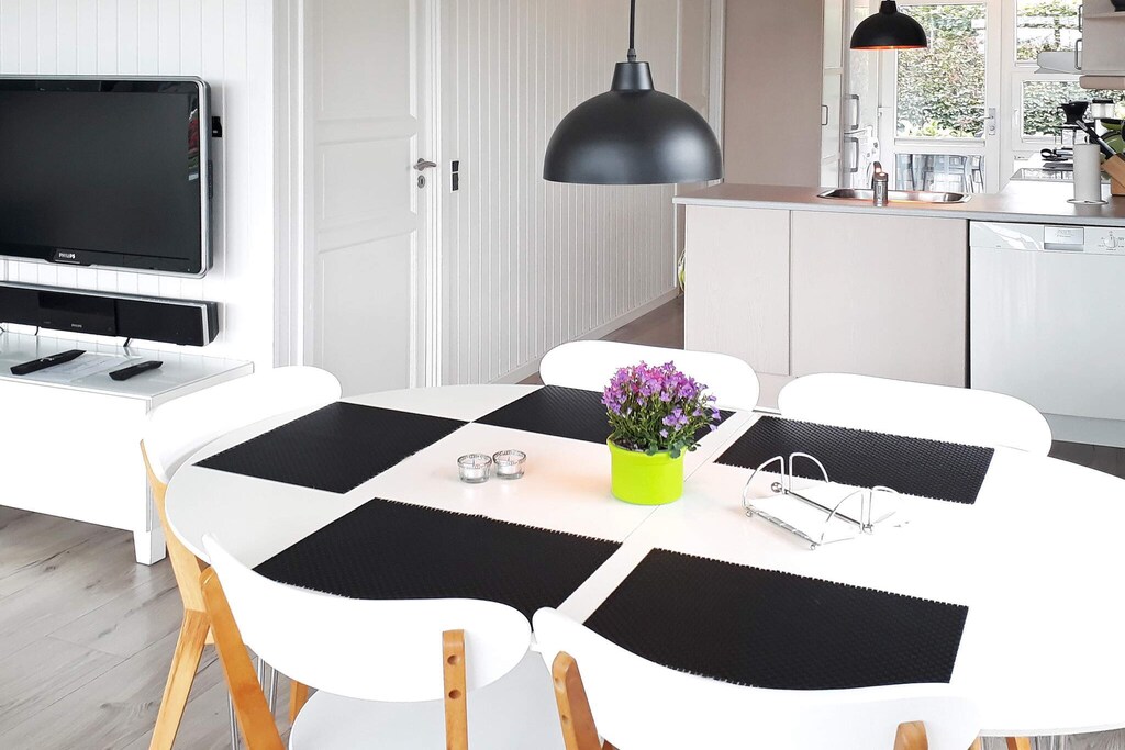De open gecombineerde keuken-/woonruimte is licht en huiselijk ingericht. Van hieruit heeft u directe toegang tot twee terrassen, waarvan de kleinere volledig omheind is. Aan de andere kant van het huis staan bovendien enkele ligstoelen en extra zitplaatsen klaar. Kinderen kunnen zich vermaken met de schommel en zandbak op het verzorgde grasveld. In totaal is er ongeveer 70 m2 terrasoppervlak beschikbaar in de buitenruimte.