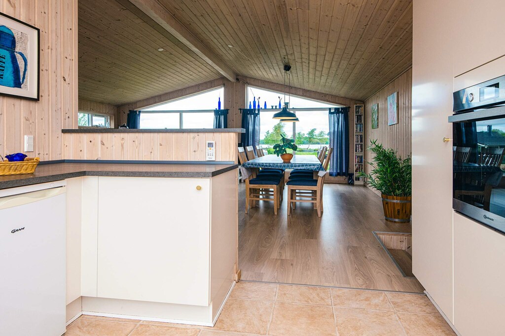 Kindvriendelijk vakantiehuis met whirlpool voor gezinnen in een kindvriendelijk gebied en met een indrukwekkend panoramisch uitzicht op Kvie Sø. Het vakantiehuis is gebouwd met de beste materialen en met veel goede details. In alle kamers en in de woonkamer zijn er houten vloeren. De keuken staat in open verbinding met de woon- en eetkamer. Het huis is in Scandinavische stijl ingericht en vanuit de woonkamer heeft men toegang tot twee terrassen, waar men op tuinmeubelen van de zon en de natuur kan genieten. Via de ingang heeft men toegang tot een terras met ochtendzon. Het huis is praktisch ingedeeld, zodat het mogelijk is om het huis in twee gebieden te splitsen. Bijvoorbeeld in een kindergebied en een volwassenen gebied. Een kamer, die een doorgangskamer is, is uitgerust met een hoogwaardige tweepersoons slaapbank. Deze ruimte is verbonden met de activiteitenruimte en twee andere kamers. Hier is een grote activiteitenruimte van 30 m2, waar zich een televisie met DVD-speler, biljart, tafelvoetbal en tafeltennis bevinden, zodat de kinderen veel ruimte hebben om te spelen en de ouders in alle rust in de woonkamer kunnen converseren. Wordt niet verhuurd aan jeugdgroepen.
