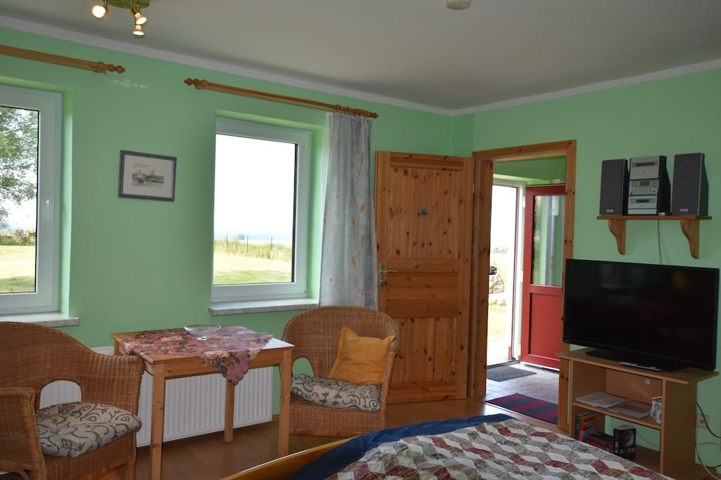 Het appartement ligt 55 meter boven zeeniveau en biedt een prachtig uitzicht, inclusief een vrij zicht op het eiland Fehmarn vanaf het terras. Gasten kunnen ontspannen in de gemeenschappelijke tropische tuin, compleet met comfortabele zitgelegenheid en barbecuefaciliteiten, ideaal om te ontspannen met lekker eten in de frisse lucht. De gastvrije sfeer en de natuurlijke omgeving van het huis zorgen voor een ontspannende vakantie.