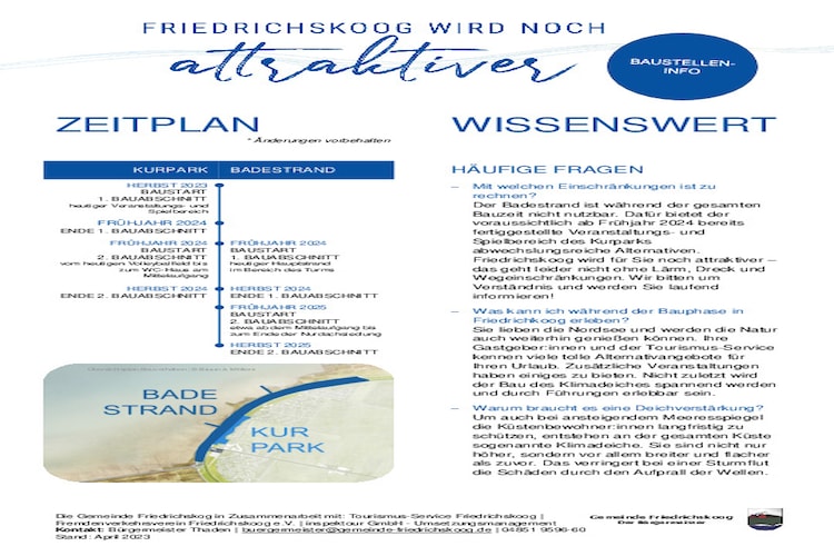 Het Kurpark in Friedrichskoog-Spitze wordt vanaf de herfst van 2023 volledig heringericht en uitgebreid met extra aanbiedingen. Als onderdeel van de noodzakelijke dijkversterking krijgt de dijk in Friedrichskoog-Spitze vanaf april 2024 een nieuw profiel om te voldoen aan de eisen van klimaatverandering.