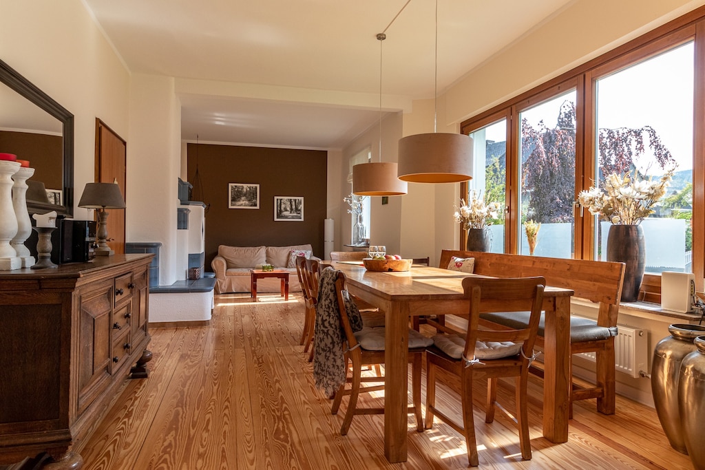 Dit kindvriendelijke huis beschikt op de begane grond over een ruime woonkamer met televisiehoek, een grote eettafel voor 12 personen en een gezellige zithoek bij de typisch Duitse "Kaminofen". Naast de woonkamer bevindt zich een openhaardkamer; heerlijk om u bij de open haard even terug te trekken met een goed boek. Deze kamer geeft toegang tot een overdekt terras, de Wintergarten. De ruime keuken is van alle moderne gemakken voorzien inclusief een Nespresso apparaat. Tot slot is er op de begane grond nog een gastentoilet. Op de eerste verdieping bevinden zich 4 slaapkamers: 3 met tweepersoonsbedden (losse 1-persoons boxsprings) en 1 met twee losse eenpersoonsbedden en 2 badkamers. De grote badkamer is voorzien van een bad met douche, toilet en dubbele wastafel. De tweede badkamer beschikt over een ruime douche, toilet en dubbele wastafel. Op de tweede verdieping bevinden zich 2 slaapkamers: 1 met een tweepersoonsbed en 1 met twee losse eenpersoonsbedden. Verder is er op deze zolderverdieping een grote speelkamer voor de kinderen met diverse speelgoed en een air-hockeytafel. De ruime tuin heeft een terras, een tuinset voor 12 personen, een bbq en trampoline. Tevens staat hier de Hottub, waar u het hele jaar door heerlijk in kunt ontspannen en genieten, bijvoorbeeld na een lange wandeling of een dag skiën. Auto's kunnen geparkeerd worden achter het huis. Fietsen of motoren in de garage beneden.