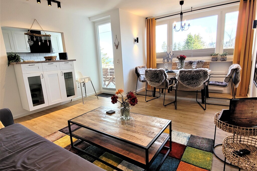 Het sfeervolle en zeer comfortabele appartement Winterberg biedt circa 55 m² woonoppervlakte en bestaat uit een hal, een badkamer met douche/toilet/wastafel, een moderne keuken met vaatwasser, inductiekookplaat, oven, etc., een slaapkamer met een tweepersoonsbed en een stapelbed, en een ruime woon-/eetkamer.