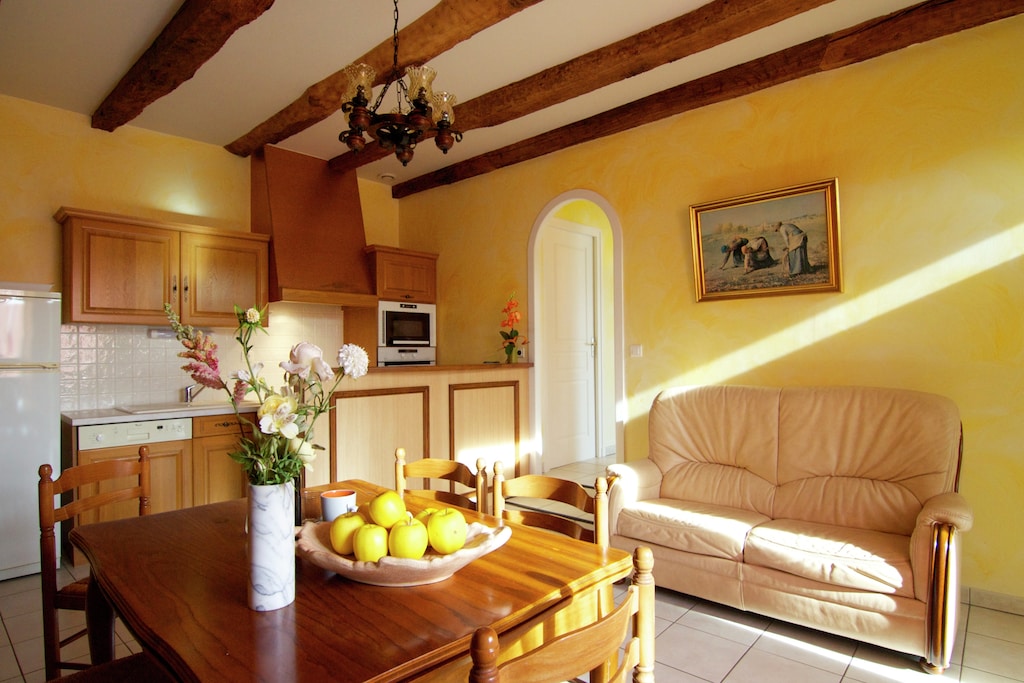 Zeer rustige en stille omgeving. Zalig vertoeven. Zeer geschikt om met je huisdier op vakantie te zijn. De tuin is groot en zeer goed afgesloten. Er is weinig voorbijrijdend verkeer en op een 5 tal min ben je bij een bakker en kleine supermarkt. Grotere supermarkten zijn er op 10 a 15 km. Het ontvangst was zeer hartelijk en kregen een uitgebreide rondleiding. De eigenaars hadden een fles water fris gezet om te drinken bij aankomst. Wat welkom was na een warme heen reis. Een gebakje en flesje wijn maakte het helemaal af. Alles was proper bij aankomst en had voor ons alles wat we nodig hadden. Wij hebben een zeer ontspannen vakantie gehad en konden genieten van de gastvrijheid van de eigenaar.