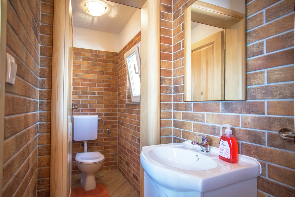Het huis bestaat uit 2 afzonderlijke verdiepingen die zijn verbonden met de binnentrap. Op elke verdieping is een volledig uitgeruste keuken, een woonkamer, 3 slaapkamers en een moderne badkamer. De keuken, woonkamer en eetkamer zijn verbonden in een grote kamer. Elke verdieping heeft ook een balkon. Dit omheinde terrein biedt zijn gasten ook een zwembad, een tuin met een houten zomerhuis, een barbecue en een buitendouche.