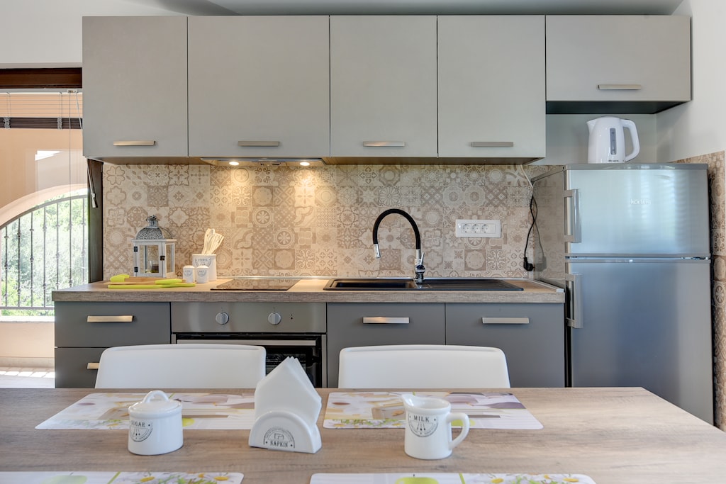 Eettafel, Kookplaat (2 kookplaten), Waterkoker, Oven, Koel-/vriescombinatie