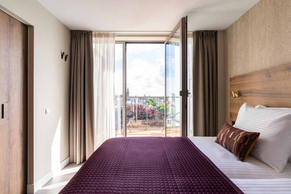 Deze appartementen met 1 slaapkamer, elk bijna 60 m² groot, bevinden zich op de vijfde, zesde en zevende verdieping en bieden een prachtig panoramisch uitzicht over de stad. Deze appartementen zijn ontworpen om plaats te bieden aan maximaal 2 gasten en zijn ideaal voor zowel korte als lange verblijven. Het interieur is een perfecte mix van natuurlijke kleuren, materialen en moderne technologie, wat een uitnodigende en comfortabele sfeer creëert. De volledig uitgeruste keuken, gezellige eethoek en comfortabele bank, samen met een grote SMART TV met Chromecast, zorgen voor een ontspannende omgeving. De slaapkamer beschikt over een comfortabel bed, een tweede SMART TV met Chromecast, een bureau en voldoende kastruimte.