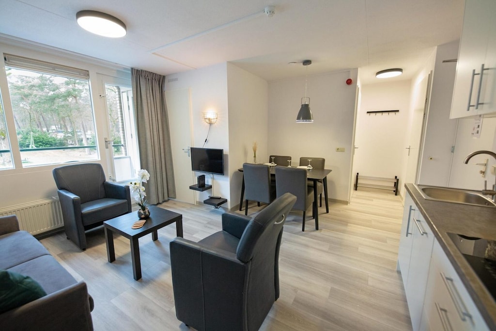 Deze ruime maisonnettes zijn perfect voor gezinnen of kleine groepen en bieden plaats aan 4 tot 6 personen. Ze bevinden zich op de tweede verdieping van het hoofdgebouw en bieden een comfortabele woonkamer met een open keuken, eetruimte en een gezellige slaapbank. De keuken is volledig uitgerust met een 4-pits kookplaat, koelkast, Senseo-koffiezetapparaat, magnetron, vaatwasser en waterkoker, en biedt alles wat u nodig hebt voor een comfortabel verblijf.