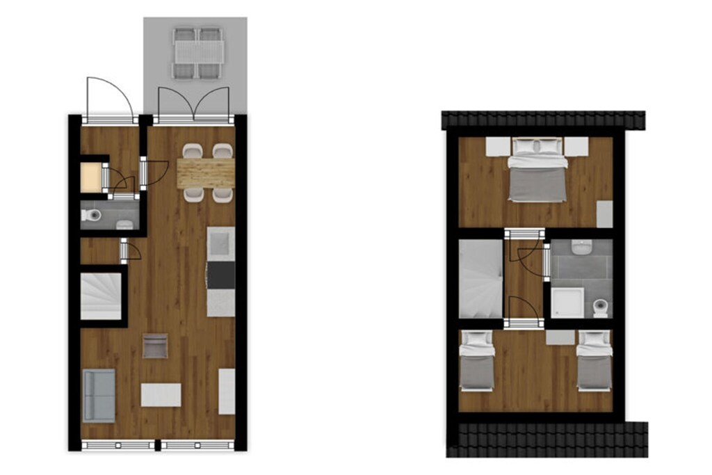 Als laatste is er een 4-pers. appartement met twee slaapkamers, verdeeld over twee verdiepingen (NL-6216-11). Bij dit type appartement bevinden de slaapkamers en de badkamer zich op de eerste verdieping (gezien vanaf de entree van het appartement). Naast het separate toilet op de entree etage, beschikt u over een tweede toilet in de badkamer.