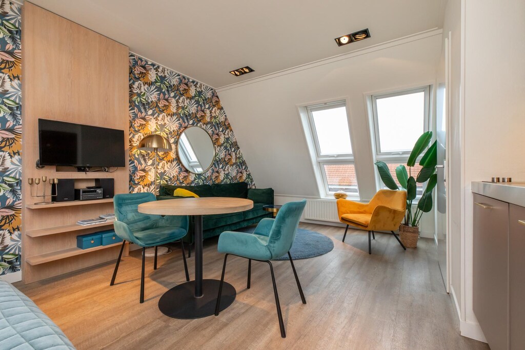 Stap binnen in deze lichte en uitnodigende studio in hartje Zoutelande, perfect voor twee. Gelegen op de tweede verdieping, verwelkomt deze luchtige oase u met warm natuurlijk licht dankzij de dakramen en een charmant schuin plafond. Ontspan in de gezellige zithoek, geniet van een filmavond of drink een kopje koffie in de eethoek, speciaal voor twee personen. De compacte kitchenette is volledig uitgerust voor een ontbijtje aan zee of een romantisch diner. Na een dagje de kust verkennen, zakt u weg in het ruime tweepersoonsbed met twee eenpersoonsbedden voor persoonlijk comfort. Een moderne badkamer met zowel een inloopregendouche als een bad laat u in stijl ontspannen.