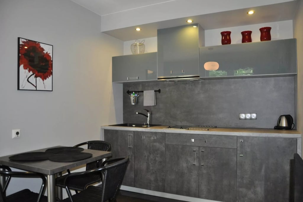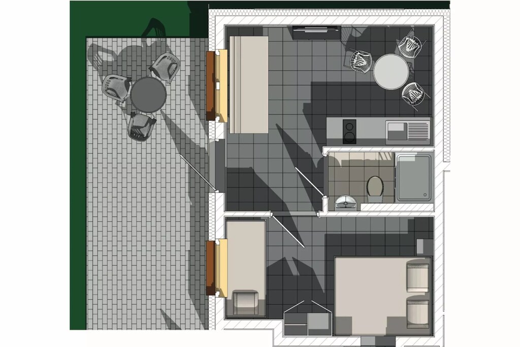 Het 2-kamerappartement is ontworpen voor 3 personen. Het bestaat uit een slaapkamer voor 3 personen en een woonkamer met een kitchenette. Badkamer met douche. De woonkamer heeft een uitklapbare bank (tegen betaling kan er een extra persoon verblijven), een tafel en een televisie. De kitchenette is volledig uitgerust. Draadloos internet is beschikbaar. Het appartement bevindt zich op de begane grond en heeft directe toegang tot het terras met tuinmeubilair. Centrale verwarming.
