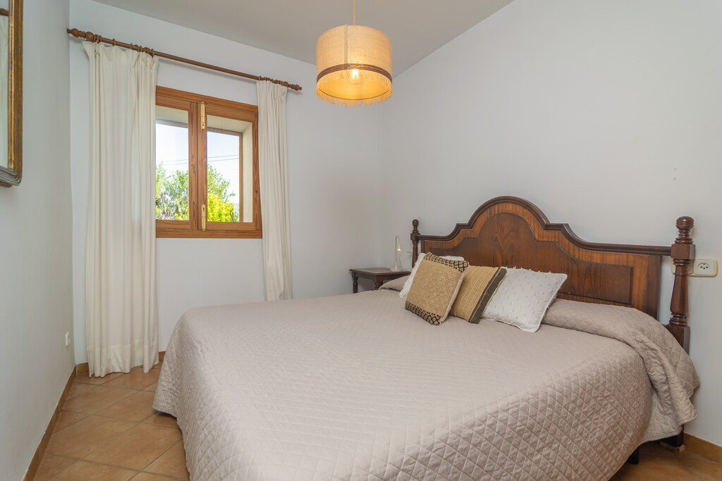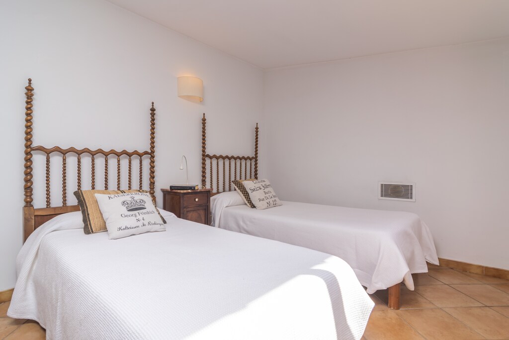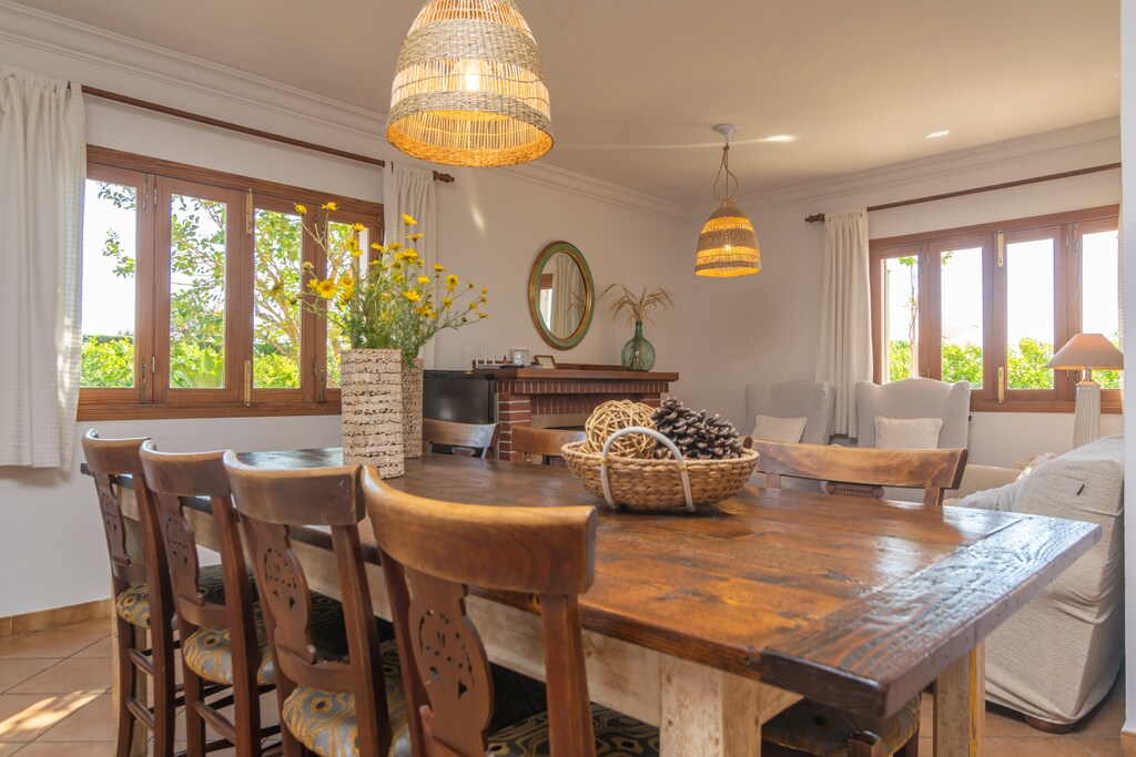Binnen beslaat de villa twee verdiepingen met een ruime woon-/eetkamer met airconditioning en satelliet-tv, ideaal voor familiebijeenkomsten. De aparte keuken is voorzien van een gasfornuis, oven en een traditionele Mallorcaanse stijl. Drie slaapkamers bieden comfortabel plaats aan gasten: een tweepersoons- en een eenpersoonskamer op de begane grond en twee eenpersoonskamers boven met een kleine zithoek. Twee badkamers met douches, een wasmachine, strijkijzer en strijkplank maken de praktische voorzieningen compleet. Een kinderbedje en kinderstoel zijn beschikbaar voor jonge kinderen.