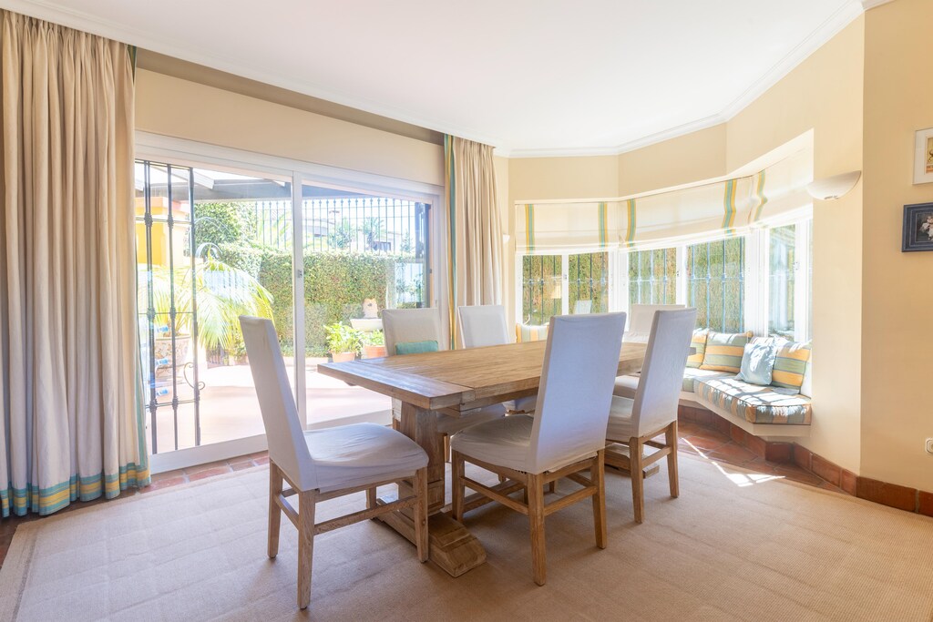Dit elegante vakantiehuis in Marbella biedt een serene oase voor maximaal 8 gasten. Gelegen in een ruime aangelegde tuin, beschikt het over een privézwembad van 12 x 6 m met ligstoelen, een tennisbaan en voldoende parkeergelegenheid. Binnen vindt u de woonkamer met een gezellige open haard en een zithoek, terwijl de eetruimte en volledig uitgeruste keuken perfect zijn voor gezamenlijke maaltijden. Meerdere terrassen en een balkon bieden een prachtig uitzicht, waardoor het een ideale plek is om 's ochtends van een kopje koffie te genieten. Verken Marbella en omgeving