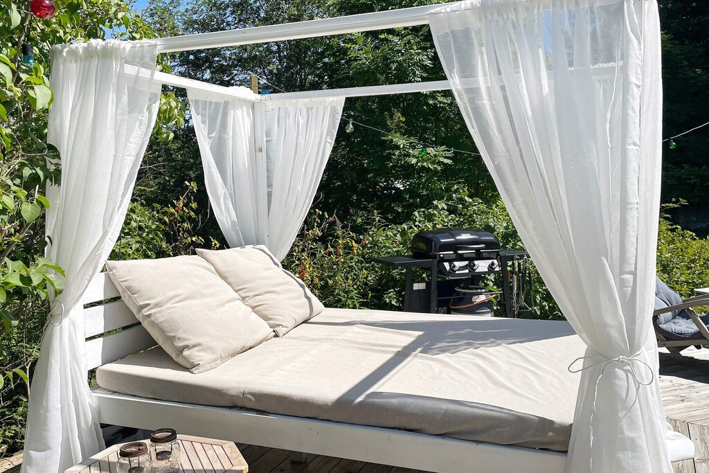 Traumhafte Lage an der Schärenküste, das erwartet Sie in dieser Küstenidylle mit zauberhaftem Grundstück auf Tjörn! Entdecken Sie Ihr Sommerparadies hier in Solvik, einem charmanten, jahrhundertealten Bauernhaus, das nur 75 m vom Meer entfernt, am Hafen von Almösund, zwischen zwei Yachthäfen, liegt. Solvik liegt nur einen kurzen Spaziergang von etwa 10 Minuten entfernt vom Badeufer in Almön. Hier können Sie auf der großen, schönen Veranda mit Essbereich und in den bequemen Loungemöbeln sowie in einer Hängematte entspannen. Es gibt zudem eine sonnige Terrasse mit Grillmöglichkeiten sowie eine bequeme „Cabana“ zum Entspannen und Sonnenbaden. Darüber hinaus gibt es eine erfrischende Außendusche und einen Garten mit Platz zum Spielen. Bitte beachten Sie jedoch, dass sich auf dem Grundstück ein 1 m tiefer Teich befindet. Aus Sicherhetsgründen ist der Aufenthalt nichtschwimmender Kinder im Haus nicht gestattet! Im Erdgeschoss befinden sich eine voll ausgestattete Küche mit Geschirrspüler, ein Esszimmer mit Holzofen, ein Wohnzimmer mit Fernseher und WLAN über Glasfaser, ein Büro und ein kleines Badezimmer mit Dusche und WC. Im Obergeschoss gibt es ein Schlafzimmer mit einem Doppelbett (160 cm Breite), ein Schlafzimmer mit einem Einzelbett (90 cm) und einen Flur mit einem Bett, das zu einem Doppelbett (2 x 80 cm) umgebaut werden kann. Ein Klappbett kann bei Bedarf aufgestellt werden. Da es sich um ein älteres Haus handelt, ist die Deckenhöhe niedriger, insbesondere im Obergeschoss. Schreibtische sind sowohl im Büro als auch im Obergeschoss vorhanden. Wenn Sie auf der Veranda sitzen und das Internet nutzen möchten, ist es möglicherweise eine gute Idee, das Modem zu verlegen, da das Mauerwerk des Hauses den Empfang etwas einschränken kann. Sie parken in der Einfahrt. Haustiere sind willkommen und fühlen sich auf der großen Grünfläche wohl. Der nächste Lebensmittelladen, Almö Livs, ist nur 100 m vom Haus entfernt, gut sortiert und verfügt über ein eigenes Restaurant und eine Apotheke. Ein Fitnessstudio, ST1 und ein Gesundheitszentrum befinden sich neben dem Laden, und vom Haus aus sind es nur 50 m zur Bushaltestelle mit guten Verbindungen nach Göteborg. Dank der Lärmschutzwand und dem Zaun hat man nicht das Gefühl, dass das Haus so nah an der Straße liegt. In der Nähe liegt das Herrenhaus Sundsby mit einem gemütlichen Café und schönen Wanderwegen sowie die Tjörnbro Arena mit einem Schwimmbad und vielen Aktivitäten. Es liegt in der Nähe von Dienstleistungen und Unterhaltung in Stenungsund mit einem großen Einkaufszentrum und von Skärhamn und dem bekannten Aquarellmuseum mit nordischer zeitgenössischer Kunst. Bis zur Großstadt Göteborg und dem Vergnügungspark Liseberg sind es etwa 55 km.