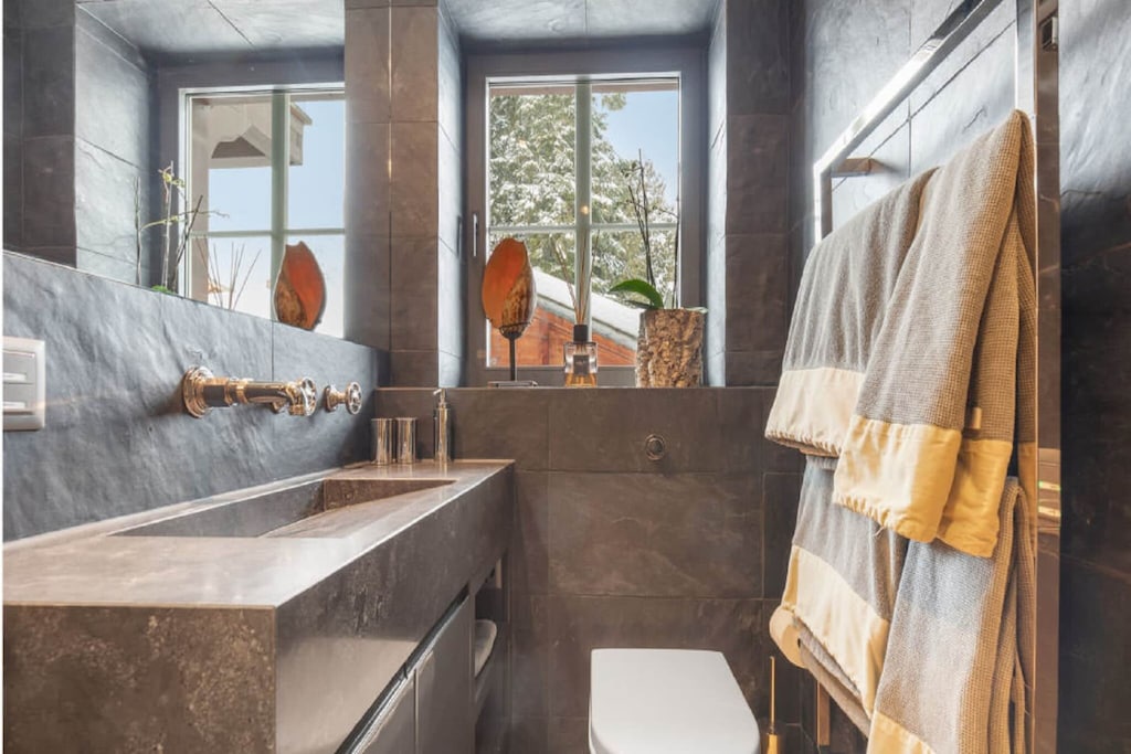 Dichtbij het treinstation van Gstaad, waardoor reizen gemakkelijk is, Elke slaapkamer had een eigen badkamer, wat geweldige privacy bood voor ons